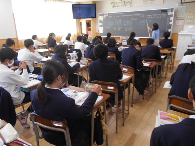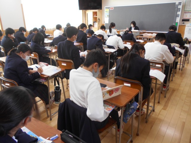 1年生にインフルエンザ罹患者が見られ、マスク着用の生徒が増えました。1組の音楽も合唱や合奏を行わず、座学に変更です。