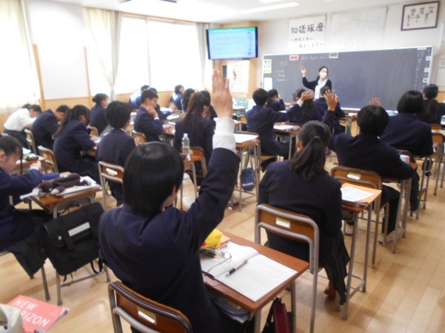 3組英語では、先生の問いかけに多くの手が挙がっていました。
