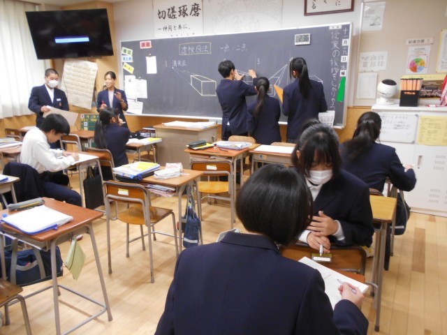 3組美術では、1点透視図法による作図にチャレンジしていました。書き方を覚えてしまえば、意外と描けそうですね。
