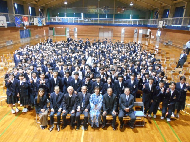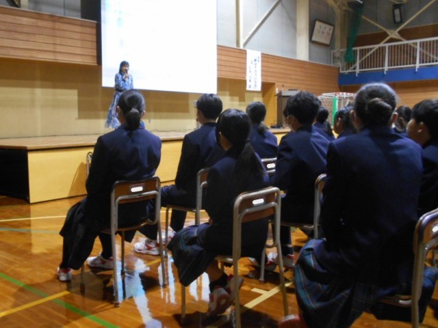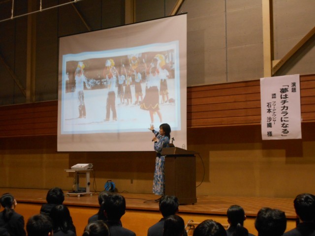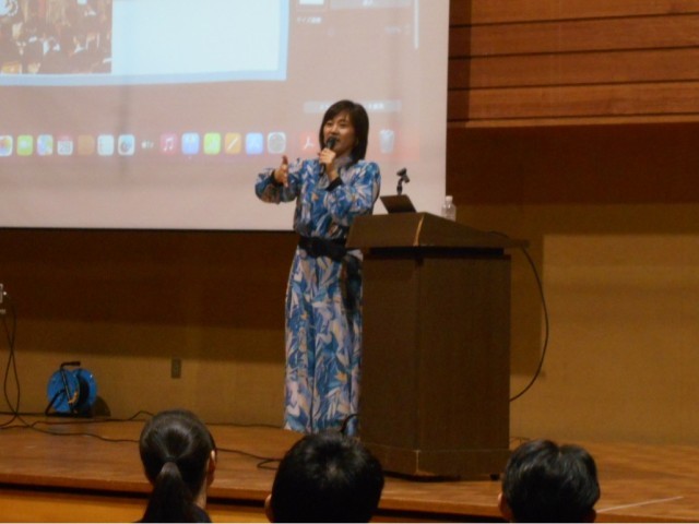 富山市出身のフリーアナウンサー 石本沙織さんを講師に迎え、教育後援会主催「先輩に学ぶ講演会」を開催しました。石本さんは、「夢はチカラになる」と題して、中学生時代やフジテレビアナウンサー時代のことなどを画像や動画を使って、楽しく紹介してくださりました。そして、夢を叶えるために「夢の種を見つける」、「好きなことを一生懸命にやる」、「人生の主役は自分」ということを大切にしてほしいとのメッセージを伝えてくださいました。最後は、「手紙 ~拝啓15の君へ~」を歌い、持ち前の歌うまを披露してくださいました。