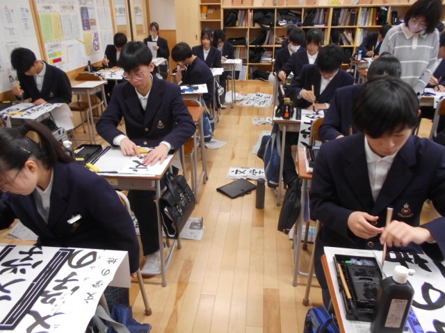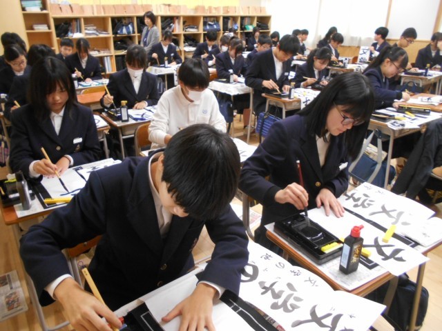 1月8日の校内書き初め大会に向けて、国語の授業は書写を行っています。2年1、2組とも書き初め練習で、「文学の地」と書きました。心を集中させて、手本に忠実に書くと、けっこういい出来になるはずです。頑張りましょう!