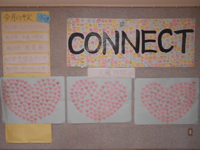 後期生徒会のスローガンは「CONNECT」(つながる)」です。生徒全員に意識してもらえるように、生徒玄関ホールの生徒会コーナーに大きく掲示されています。