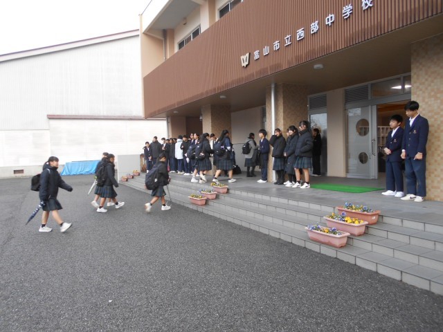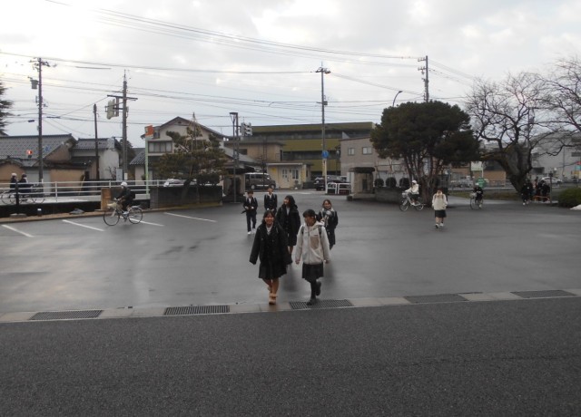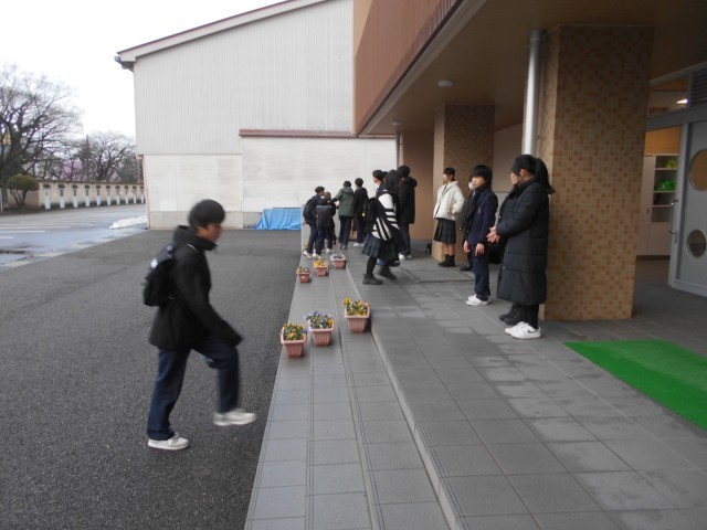3学期最初のウェイクアップスマイルを行いました。生徒会役員に1年学級代表やボランティア参加生徒が加わりました。今日は比較的暖かい朝でしたが、来週は寒くなり、大雪の予報も出ています。自転車通学はしばらく無理だと思うので、登校方法について、家の人と相談しておこう。