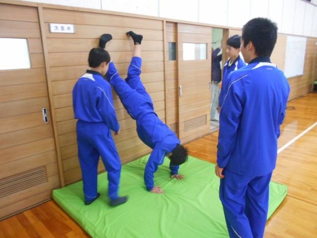 3組保健体育はマット運動の技を練習しました。1年前はできなかった前転、後転ができるようになったと披露してくれた生徒がいました。