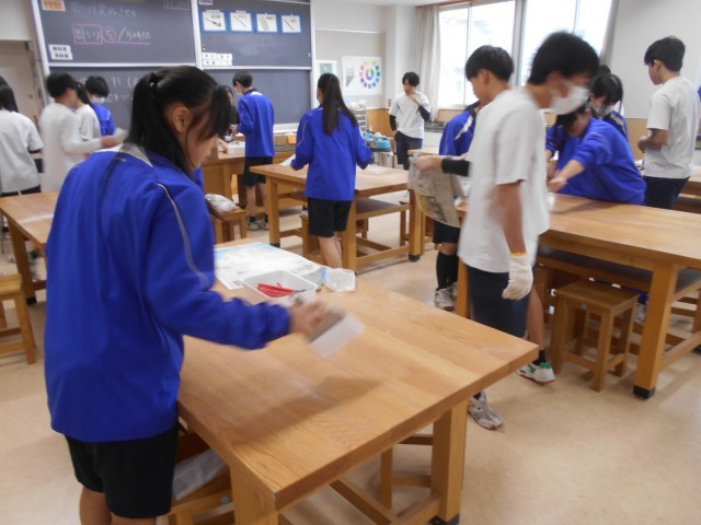 写真クリックして上から1組社会、2組美術、2組の石彫作品、3組理科の様子