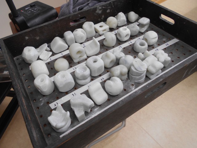 2組美術では、石彫制作に取り組んでいます。授業が終わるころには、石を彫ったり削ったりして出た、真っ白い粉で教室中が大変です。しかし、全員で協力してきれいに清掃しています。作品もかなり仕上がってきたようです。