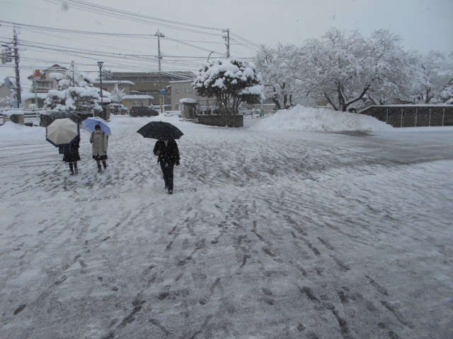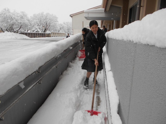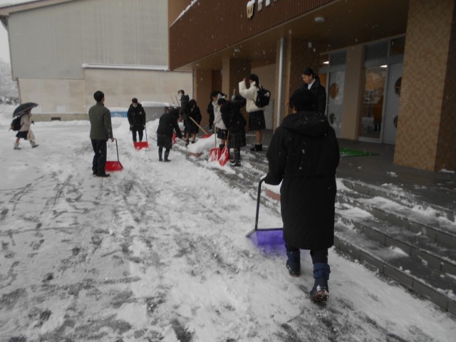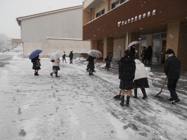 今朝も20センチ程度の新雪が積もり、除雪当番3年2組とボランティア参加の生徒が活動しました。生徒玄関前や来賓玄関前だけでなく、バリアフリーのスロープ、ごみステーション等も進んで除雪してくれました。どうもありがとう。