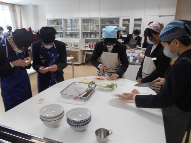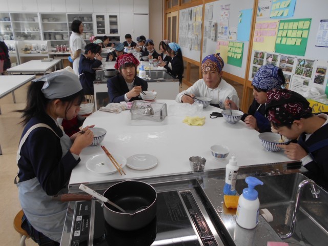 2組家庭科では、行事食について学習しており、今日は「雑煮」を作りました。グループで役割分担し、餅を焼いたり、具材を切って煮たりして、雑煮を完成させました。そのあとは、雑煮を皆で味わいました。ちょっと汁が濃かったりしましたが、おいしかったです。