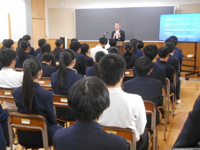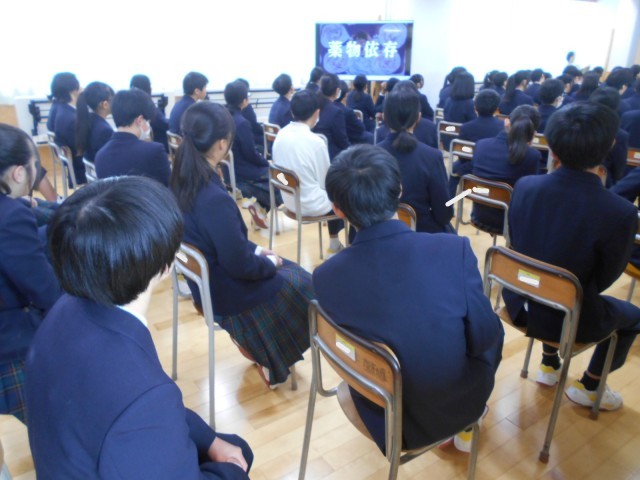 2年生では、少年サポートセンター東部分室の少年補導員の方を講師に招き、薬物乱用防止教室を行いました。薬物依存の恐ろしさや自分にとって遠い世界の話ではないこと等を分かりやすく教えていただきました。薬物乱用は「ダメ。ゼッタイ。」