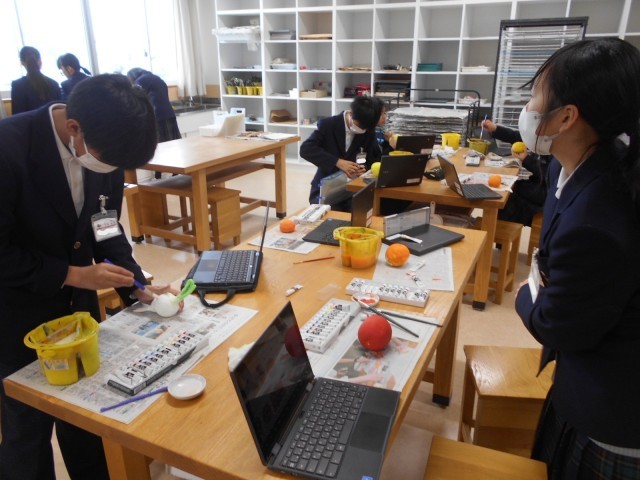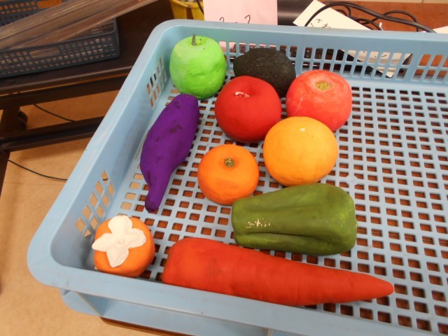 2組美術では、課題「本物そっくりに着色しよう」で、紙粘土で作った果物や野菜等に色を塗り、本物そっくりに仕上げる作業を行っていました。みかんやアボカドはかなり本物でした。
