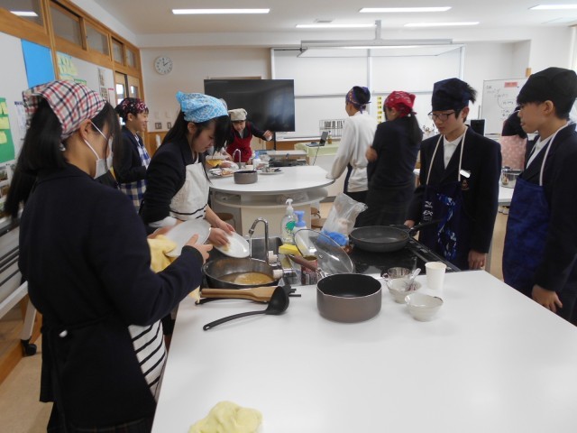 2組家庭科は、調理実習でハンバーグなどを作りました。おいしくいただいた後は、片付けまでしっかりと。