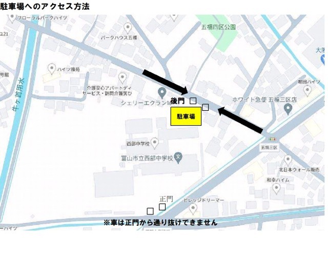 ・新入生説明会に来校される際には、校舎裏側の駐車場(約50台)を利用ください。