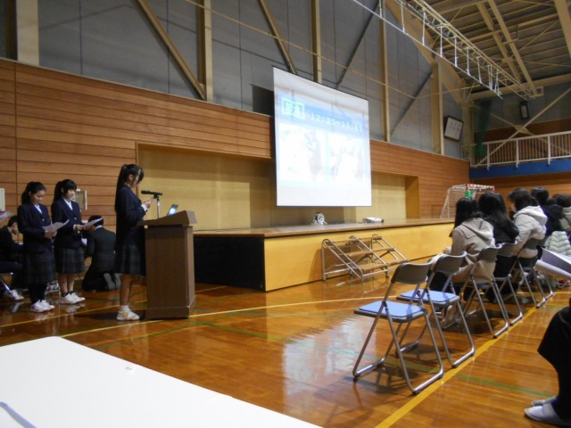 1、2年生の生徒会役員等20数名が受付や案内の役割を担い、説明会の冒頭では校歌を歌って紹介しました。その後、校長挨拶、生徒会長挨拶と続き、生徒会執行部が一日の学校生活や部活動、生徒会活動等について、スライドで紹介しました。