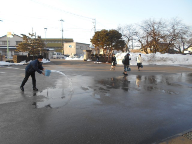 今朝は、昨日の雨で溶けた雪が流れ出し、放射冷却の冷え込みで前庭の地面を凍らせていました。登校する生徒の足元を安全にしようと、先生が水をまいて、氷を溶かしました。