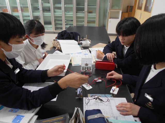 3組理科は電気回路の学習をしています。直列回路と並列回路、それぞれに流れる電流を電流計で測定していました。