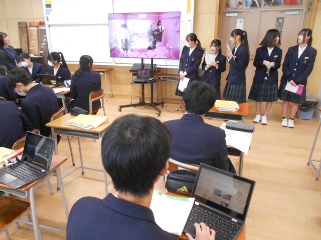 1組音楽では、グループに分かれ、好きな曲を選び、他の人に曲の良さをPRするためのプレゼンテーションを作成しました。今日はその発表会を行いました。皆、クラスの仲間たちの曲に対するいろいろな感性に触れ、興味深そうに聞いていました。
