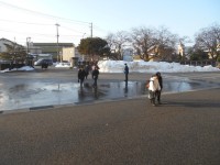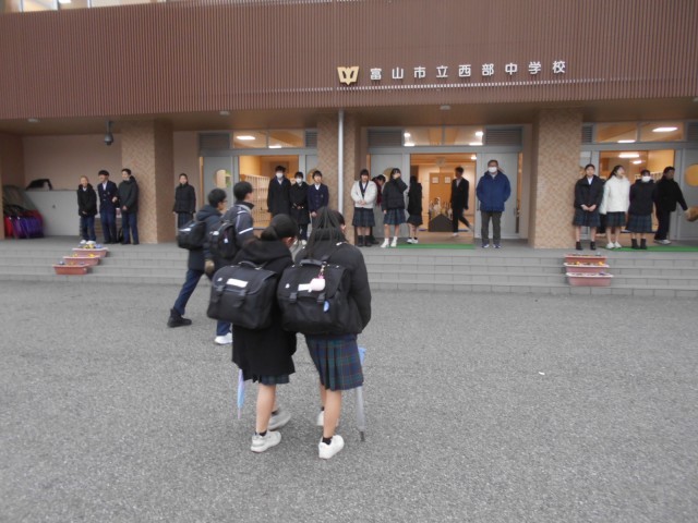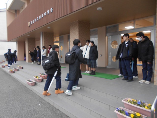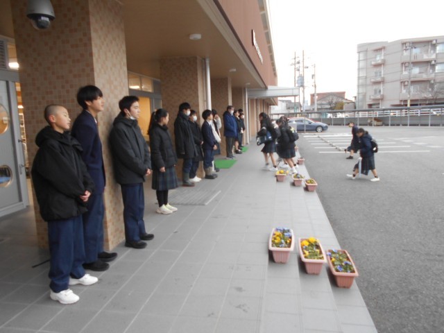春はもうすぐそこまで? ウェイクアップスマイルは生徒玄関前で行われました。交わされる「おはよう」も自然と大きくなります。