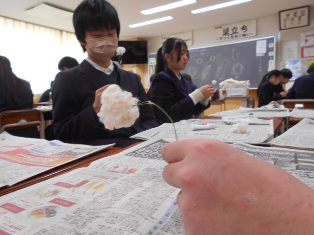 今日は1~3限は学年末考査を実施し、その後、授業が行われました。2組家庭科では、西部中で栽培・収穫した綿花を使って、コサージュづくりを始めました。