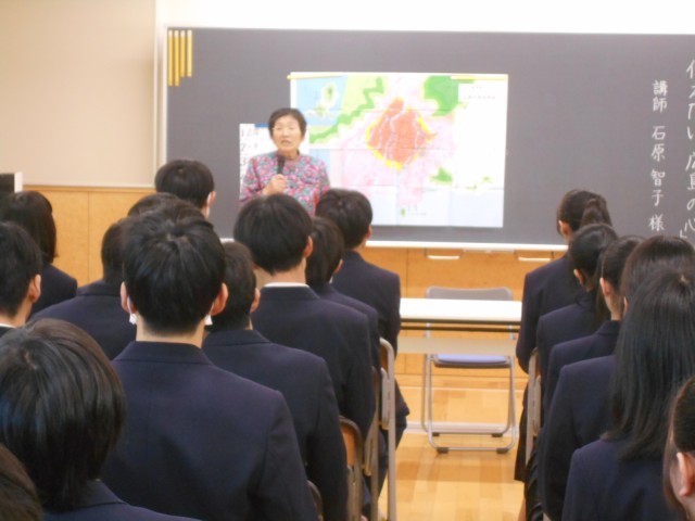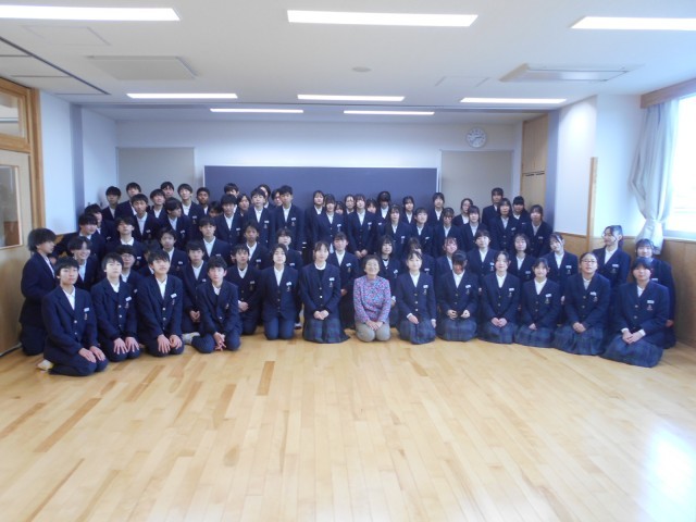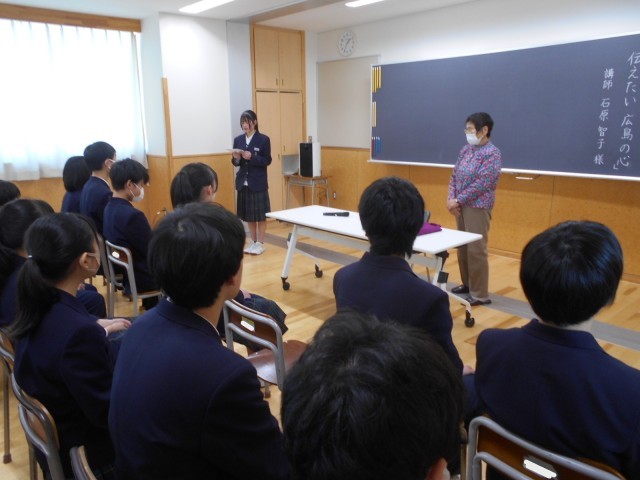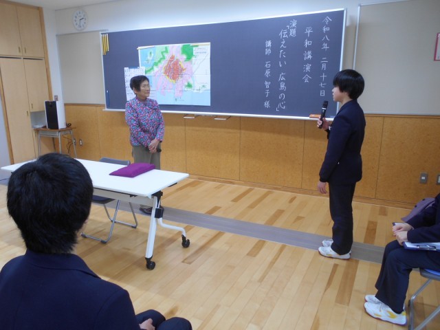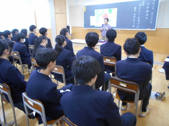3学年になっての修学旅行では、広島を訪問し、平和学習を行います。今日はその事前学習として、広島市の石原智子さんを講師に招き、平和講演会を開催しました。石原さんは母親の胎内で被爆し、その後、母親から聞いた原爆の体験談等をお話ししてくださいました。そして、平和な時代の私たちは、どう生きるべきかを考えさせられる講演会でした。石原さんとは、5月の修学旅行時、平和記念公園で再会する予定です。