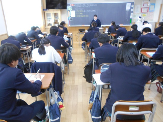 1、2限と学年末考査に取り組み、その後も授業を進めていました。1組英語は、大型モニターの表示された質問の答えを考え、英文にして答えるコンテストを行いました。班対抗なので、班員で協力して英文を考えてもОKです。