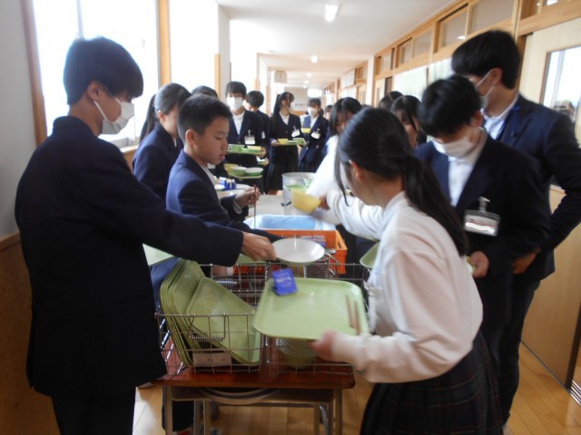 給食委員会が給食準備の早いクラスを放送で発表しました。今日の1位は1年2組。そこで、後片付けの様子を見に行くと、1年3クラスとも、後片付けも早かったです。1年間ですっかり学校生活にも慣れ、一人一人成長しています。