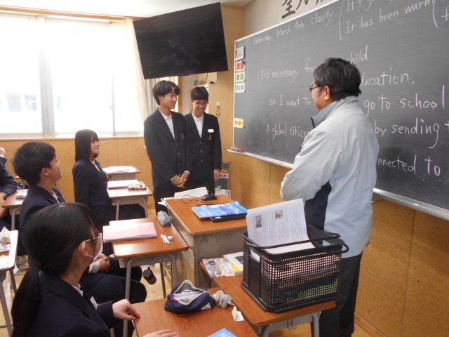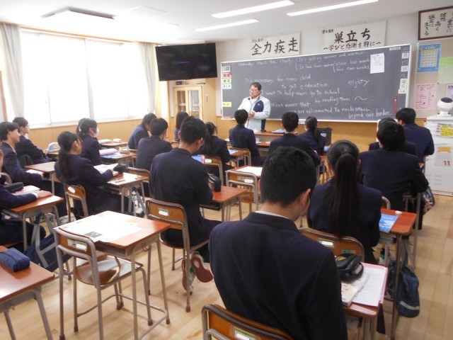 明日から県立高校一般入試で、来週は卒業式練習中心となるため、今日は学年外の先生が担当される最後の授業となりました。1組英語の終わりには、2名の生徒が学級を代表して担当の先生に謝意を述べ、先生からもお返しの言葉がけがありました。
