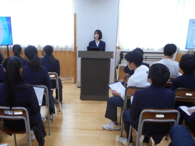2学年では、2年前に本校を卒業した6校6名の高校生の先輩を講師に招き、「高校生の先輩に学ぶ講演会」を行いました。先輩方は、それぞれの高校の特徴や高校生活の様子等をプレゼンテーションしてくれました。また、受検に向けてのアドバイスもいただきました。2年生にとって、進路について真剣に考える貴重な機会になりました。