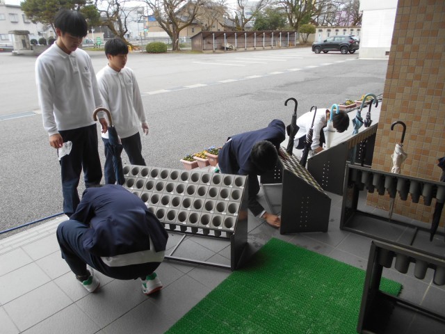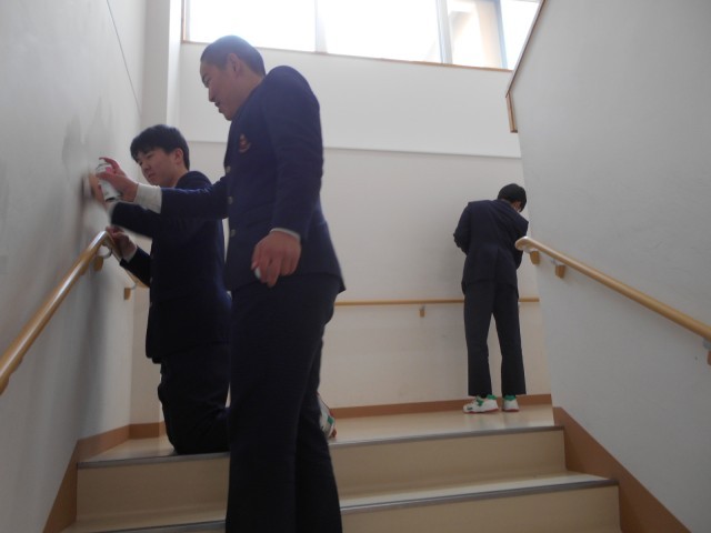 県立高校一般入試2日目の今日、3年生の進路確定者が登校し、自主学習の後、小一時間ほど、校舎内の清掃や汚れ拭きを行ってくれました。一生懸命、入試に取り組んでいる人たちの分まで頑張ってくれました。来週、3年生全員が揃ったら、卒業式に向けて最後の準備・練習開始です。