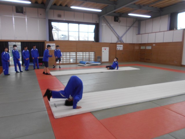 3組保健体育では、マット運動での連続技に挑戦していました。特に技と技のつなぎの部分を工夫しようと取り組んでいました。