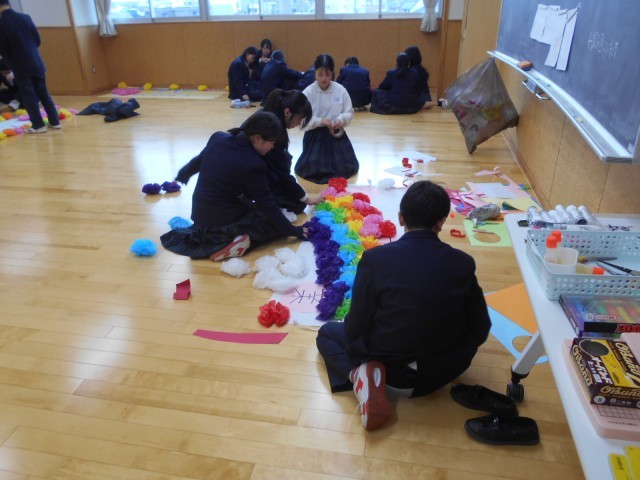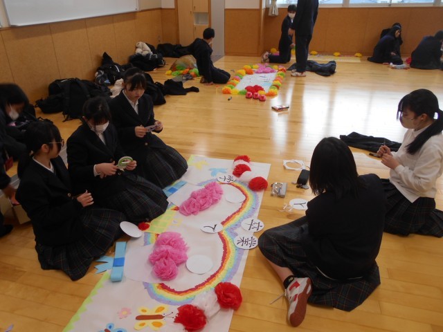 1年生の卒業式準備は、有志を募って、卒業式当日の3年教室内の祝画を作成しました。明日の午後に3年教室内の飾り付けを行います。