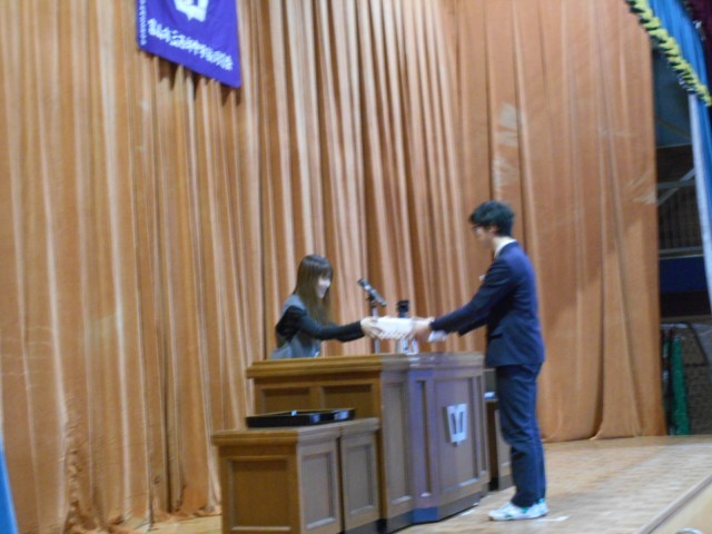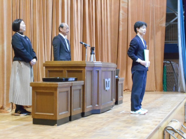 同窓会長さんから同窓会記念品の印鑑、育成会長さんから育成会記念品の卒業証書ホルダーの目録が渡されました。その後、校長から3年生の代表生徒に修了証が渡されました。