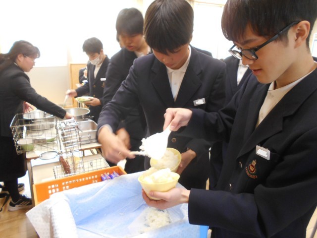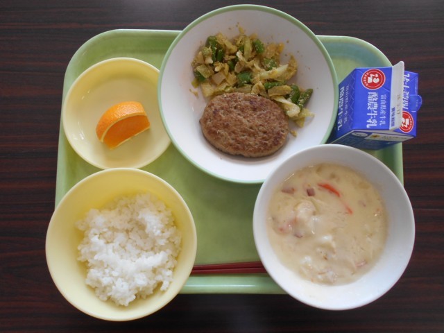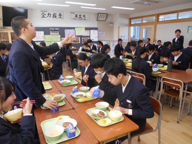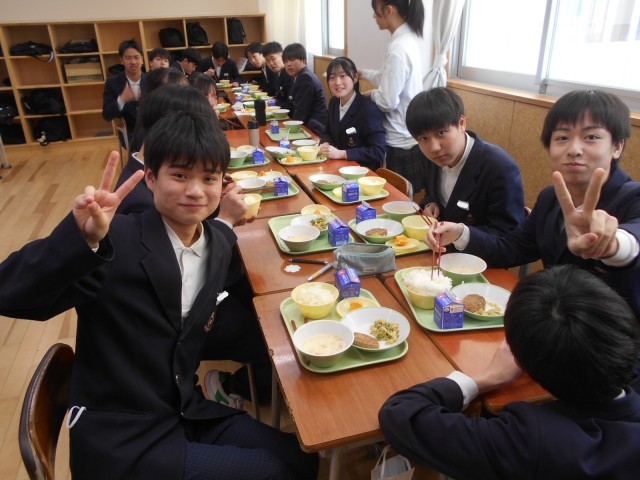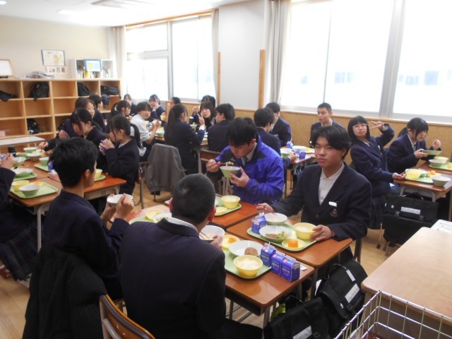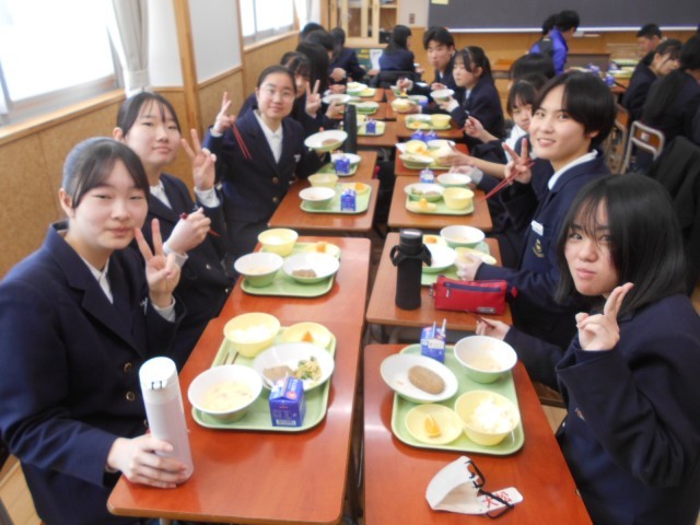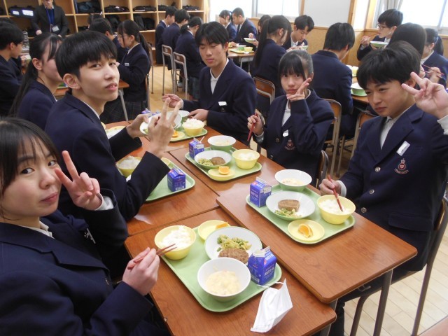 高校には給食はなく、弁当持参か学食利用になります。今日は3年生にとって、最後の学校給食です。献立はハンバーグやシチュー、オレンジも付いて、豪華でおいしかったです。もし、将来、学校給食が食べたくなったら、小学校か中学校の先生になってください。