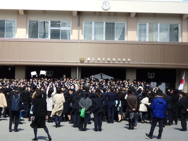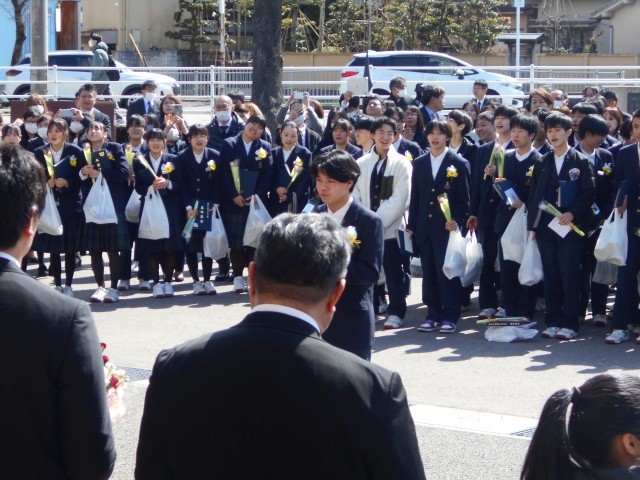 卒業生115名は各学級で最後の時間を過ごし、前庭で卒業生と教員が一緒に校歌を歌ってお別れしました。卒業生の皆さんの明日からの人生に幸多かれと祈ります。