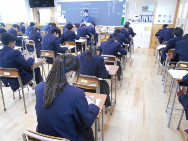 今日は2学期後半から取り組んできたテキスト学習の成果を確認するテストです。2年生の皆さんには、このテストを受けて、いよいよ自分も3年生になるんだ、受験生になるんだ、と自覚してもらえるとよいです。