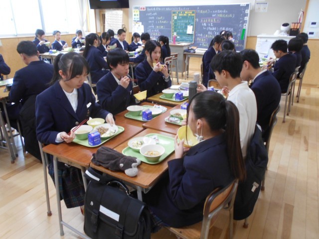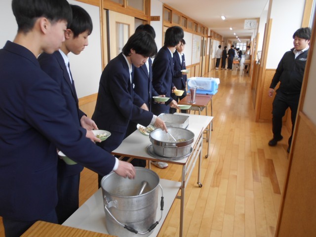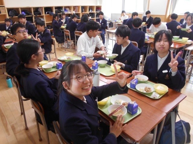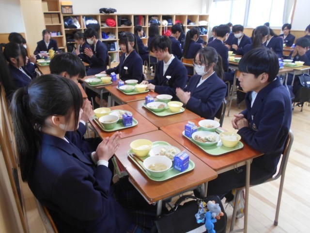 2年生の給食は落ち着いたものです。食事量をやや気にする人も多く、食缶にごはんやおかずを戻す生徒もほどほどいます。でも、それをおかわりして、ほとんど食べ尽くすクラスもありました。ひとまず、4月まで給食とはお別れですね。