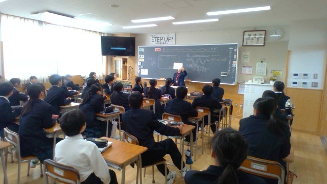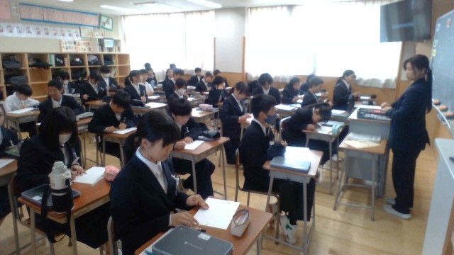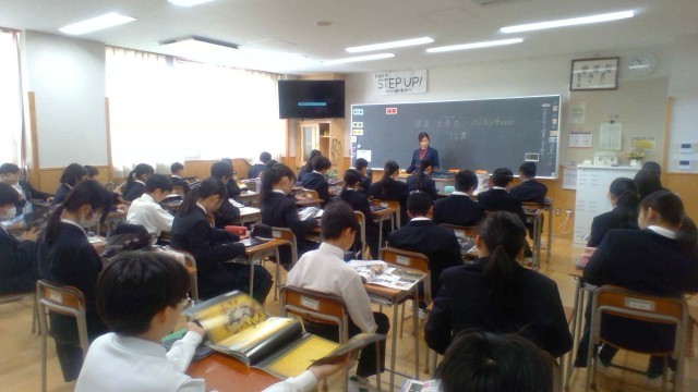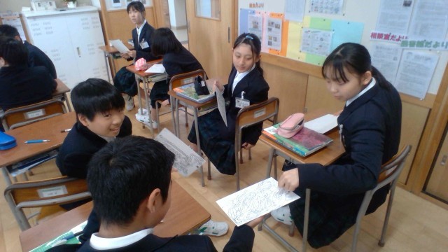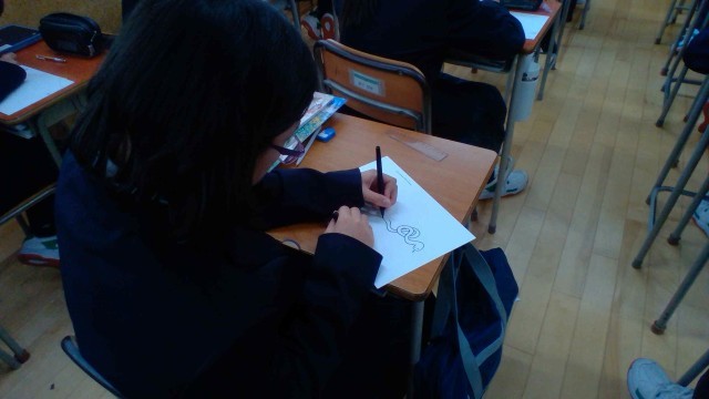 1年美術の授業の様子です。今日が初めての授業でした。「長~いヘビ」を描きました。生徒たちは、工夫しながら画用紙一杯に「長~いヘビ」を描いていました。描き終わった後、みんなで作品を鑑賞しました。