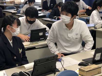 3年生の技術・家庭科では、プログラミング学習を行っています。男女ペアで、目的の動きをさせることができるか、必死に考えています。