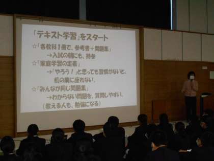 テキスト学習について学年集会を行いました。テキストを使って、中学校3年間分の総復習を行います。持ち物の少ない期末考査期間中に自宅に持ち帰る予定です。ご家庭でも是非話題にしていただき、毎日の取組への励ましをお願いいたします。