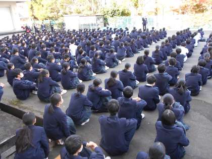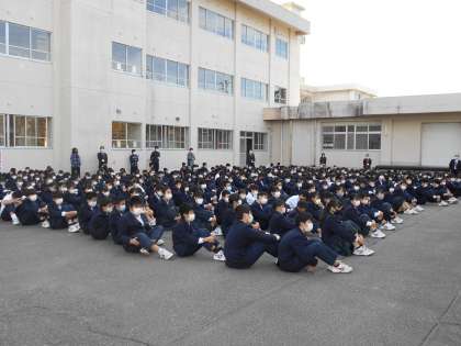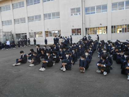 今回は、仮設校舎第一理科室出火を想定し、校舎裏側駐車場を避難場所として訓練を実施しました。避難指示から避難場所に集合するまで、速やかに行動することができました。