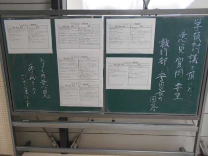 後期生徒会の活動がスタートしています。今年度は、生徒が一堂に会しての生徒総会を開くことができていないため、学級討議で出された意見に対する執行部・専門委員長の回答が掲示されています。