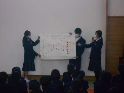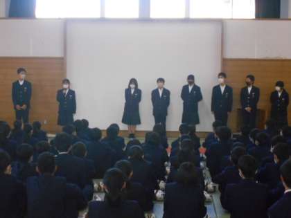 12月9日(水):第1学年 学年集会 公開日 2020/12/09 更新日 2020/12/09 1学年 前期学年生徒会最後の取組、西中6箇条の振り返りをグラフで説明して、自分たちが意識していかなければならないことを、再確認しました。その後、後期学年生徒会の自己紹介、学年目標の引き継ぎを行いました。