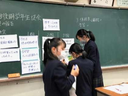 12月10日(木):第2学年 後期拡大生徒会2 公開日 2020/12/10 更新日 2020/12/10 2学年 各クラスの班長で話し合って出した案を、さらにみんなで話し合い、6つの課題に絞り込みました。
