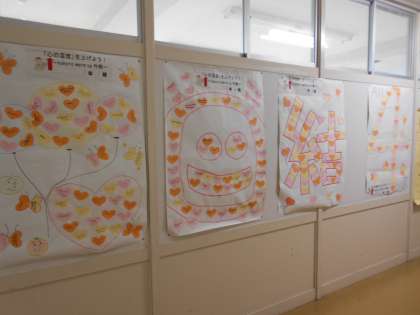 人権週間の取り組みとして、「『心の温度』を上げよう!〜kokoro warm up作戦」を行いました。1枚1枚のハートに「友達から言われて嬉しくなった言葉」が書かれています。「困ったときに助けてくれてありがとう」「笑わせてくれてありがとう」など、読んでいても心が温まります。
