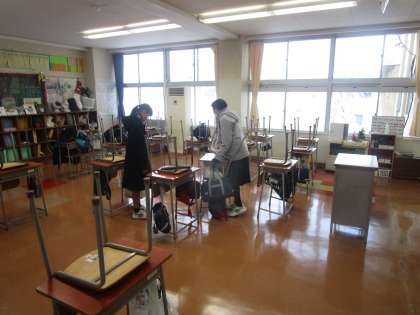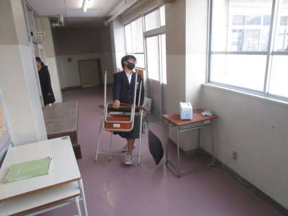 12月17日(木)ワックスがけを終えて 公開日 2020/12/17 更新日 2020/12/17 1学年 昨日ワックスがけを行い、廊下に出してある机や教壇を朝早く来た生徒が、進んで運んでくれました。中には2人だけで全員分の机を運んだクラスも…。本当にありがとうございました。
