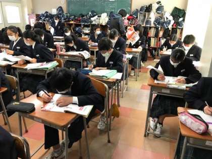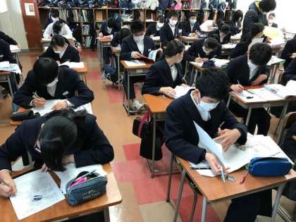12月17日(木) 2年生の上級学校調べ 1 公開日 2020/12/17 更新日 2020/12/17 2学年 2年生は、「進路のしおり」や各高校のHP等を参考に、高校調べをしてきました。 今日は、資料を基に、用紙にまとめました。 写真=2年1組