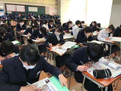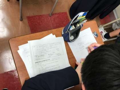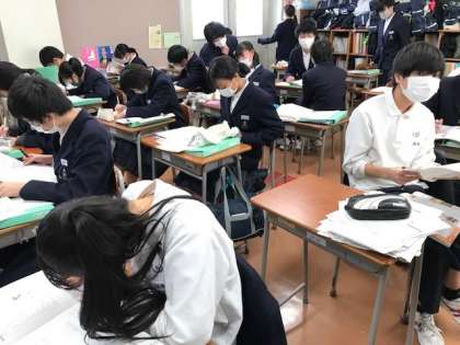熱心に調べて、2枚目の用紙をもらって書いている生徒も。 写真=2年2組