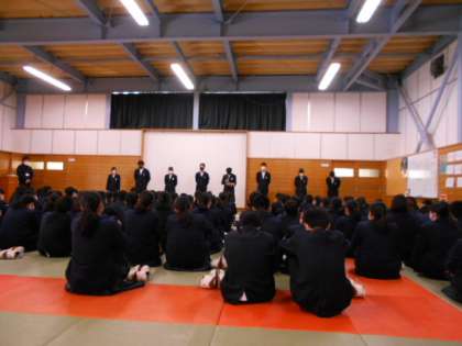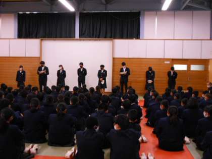 学年集会を行い、各クラスの学級代表のあいさつがありました。卒業に向けて、学年全体で思い出が作れたらよいですね、という話もありました。