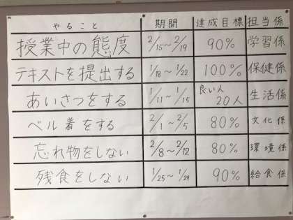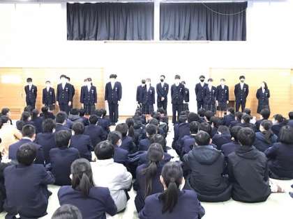 12月18日(金) 2学年の後期学年生徒会発会式 2 公開日 2020/12/18 更新日 2020/12/18 2学年 7月と12月に取った実態アンケートを基に、学級役員で決めた6つの課題に取り組みます。 各クラスには、6つの係があり、それぞれの係で一つの課題を担当します。達成目標は高くはないですが、2年生120名みんなで、達成したいという思いで決めました。 写真(上)=活動計画表 写真(中)=学年代表と学級代表の、自己紹介と抱負 写真(下)=書記と班長の自己紹介