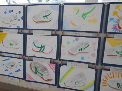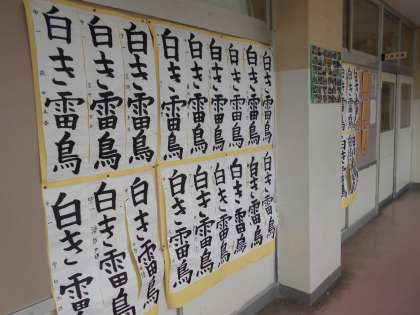 1年生の教室前廊下に、習字(書き初め練習)作品と美術作品が展示されています。