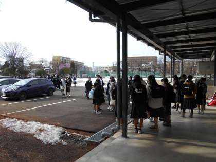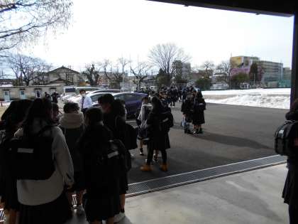 通知表をもらい帰宅する生徒たちの様子です。